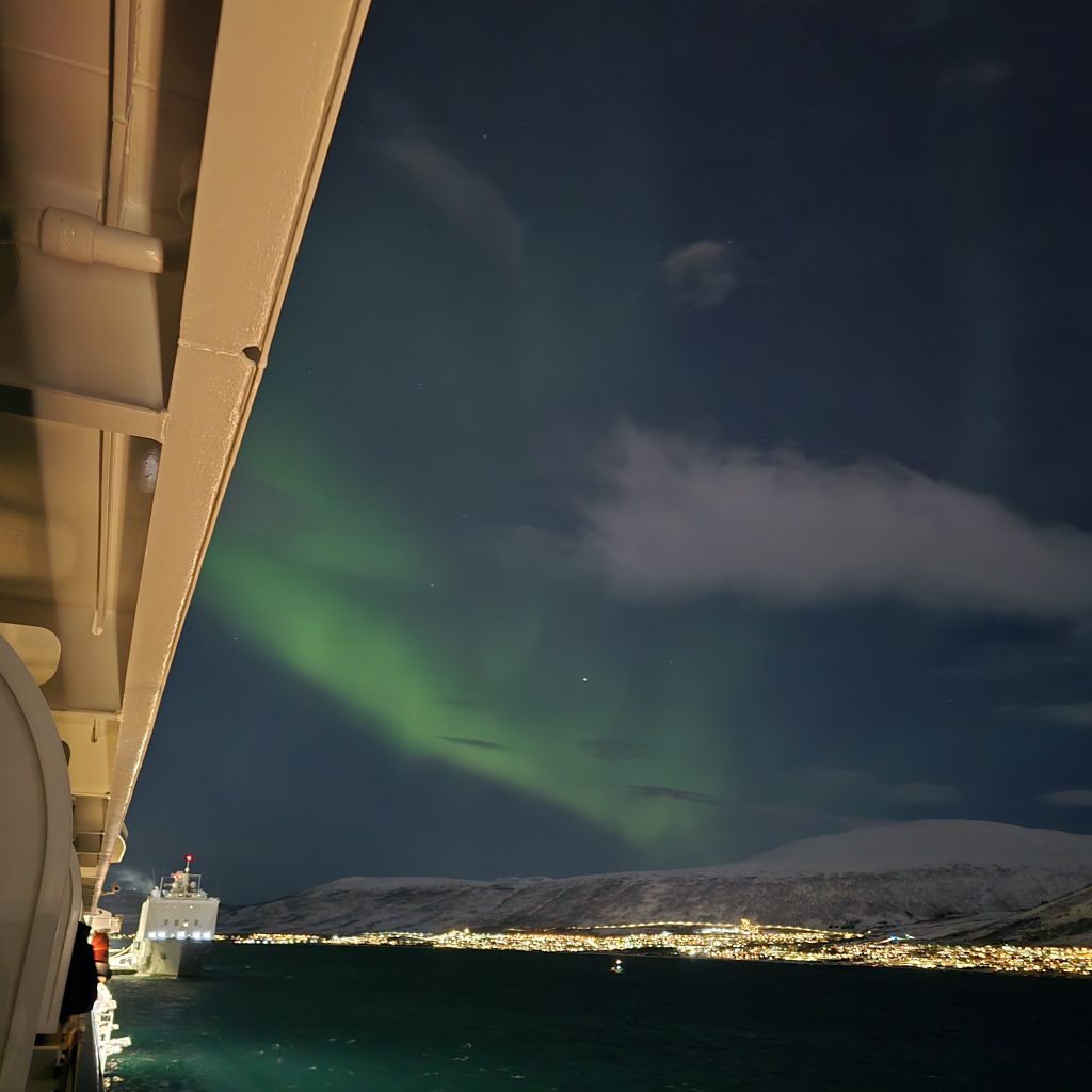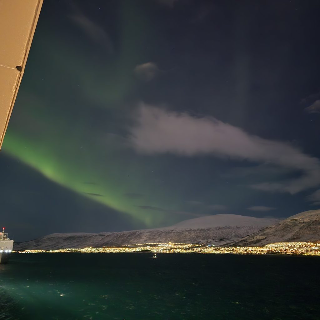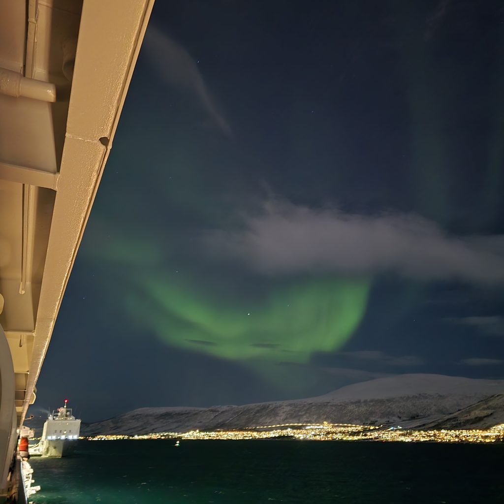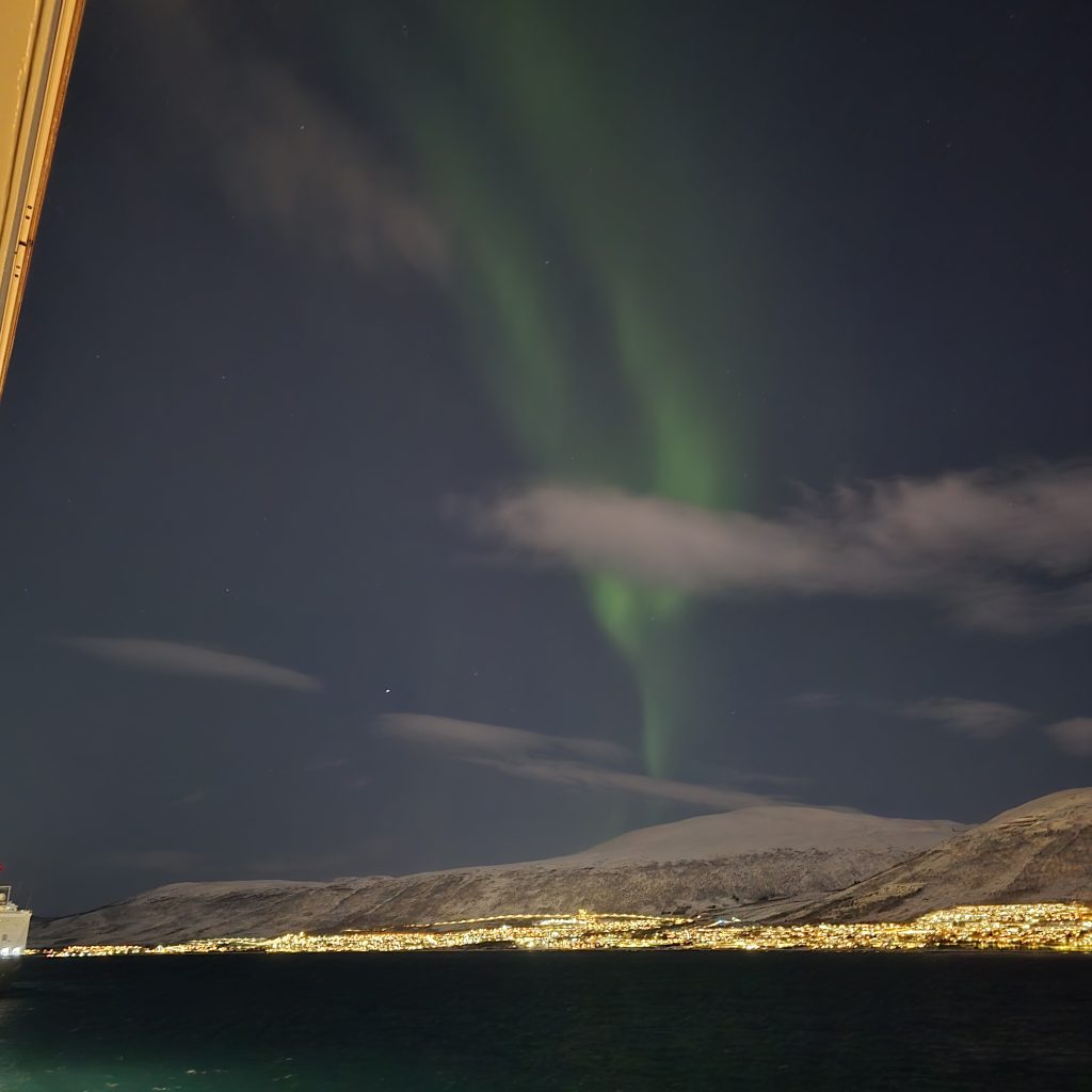 There will be another post about our adventures earlier in the day. At about 825pm, my sister was on an excursion to see the northern lights in Tromso. And I was in our parents stateroom, getting ready to say good night and return to mine. Our cruise director, Andre, came over the intercom system to say they were viewable from the port side. So my parents came back with me and saw the lights from that vantage point.
